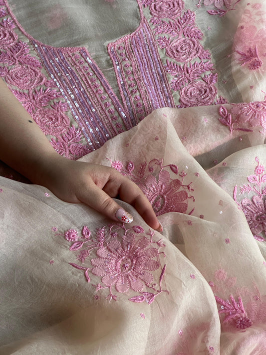 Pearl Pink Shade Chikankari x Applique Organza Kurta Set