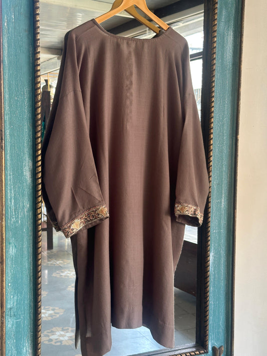 Rosy Brown Shade Kashmiri Pashmina Phiran with Handcrafted Ari & Chikankari Embroidery