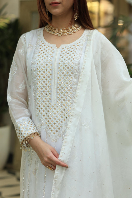 White Malmal Pearl Work Chikankari A Line Kalidar Kurta With Dupatta