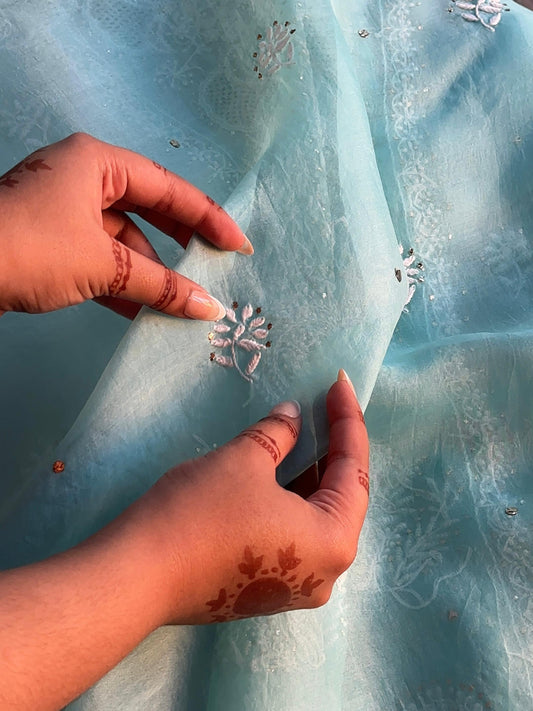 Ice Blue Noor Organza Silk Chikankari With Kamdani Fabric