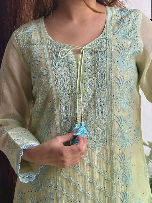 Green Shade Mulmul Pearl White Chikankari Ready to Wear Kurta Set