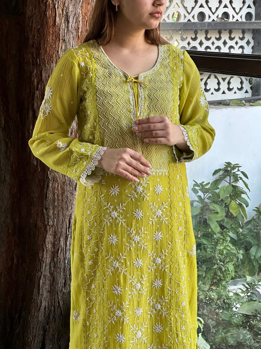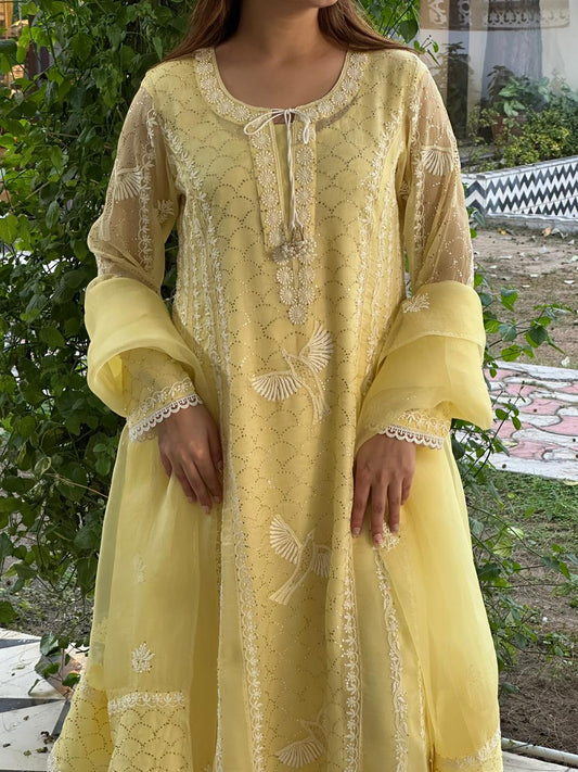 Lemon Custard Daraz Applique Chikankari Mukaish Kurta Dupatta Set