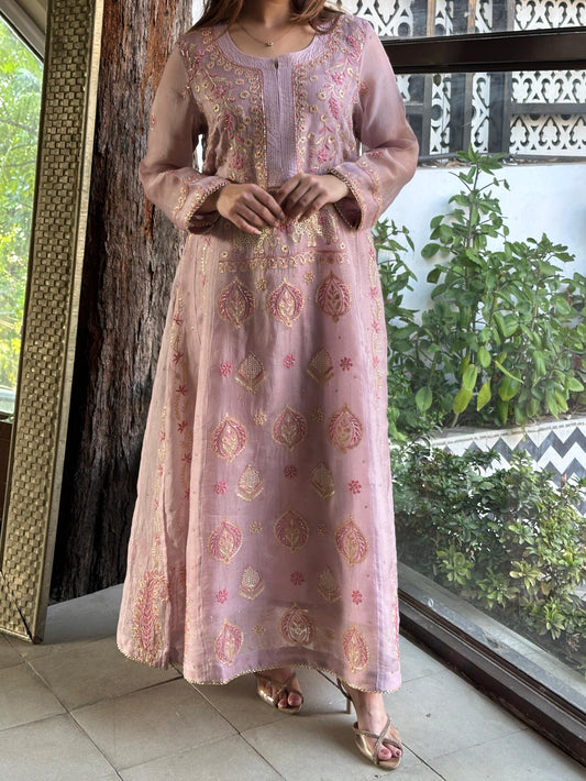 Mauve Pink Shade Noor Organza Chikankari A Line Kurta With Dupatta