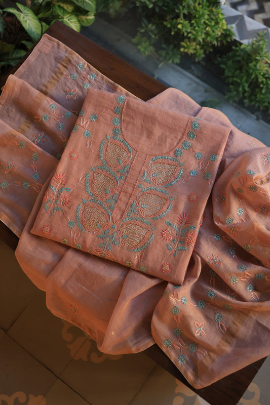 Dusty Peach Mal Cotton Chikankari Unstitched Kurta Dupatta Fabrics With Kamdani