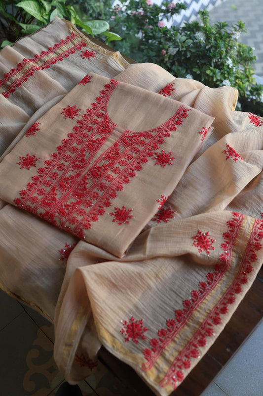 Persian Red Shade Mal Cotton Fine Chikankari With Kamdani Work Unstitched Fabric