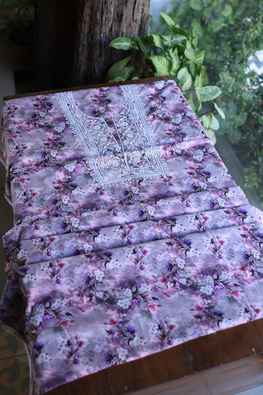 Dusty Purple Floral Cotton Kurta Fabric with Chikankari Embroidered Neckline