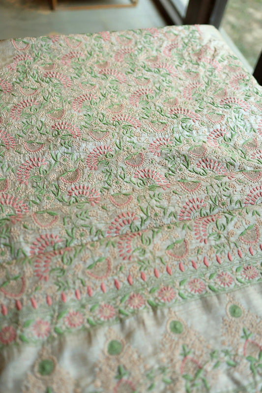Sea Mist Shade Rasm Silk Chikankari With Ari Work Unstitched Kurta Dupatta Set