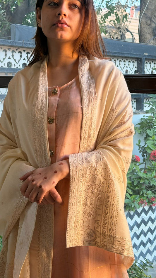 Natural Beige Shade Saman Pashmina Resham Thread Chikankari Shawl