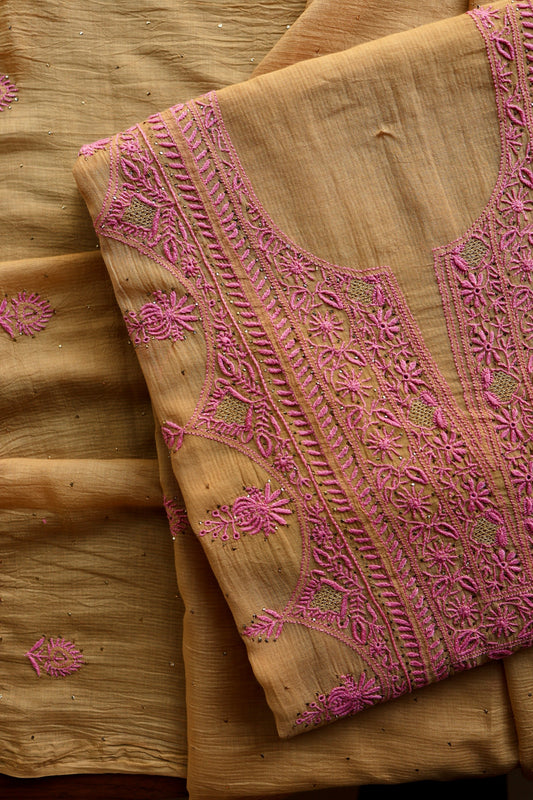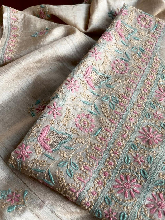 Natural Tussar Resham Chikankari Unstitched Fabric Kurta Dupatta Set