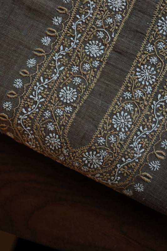 Dark Beige Shade Paper Tussar Resham Chikankari Unstitched Kurta Dupatta Set