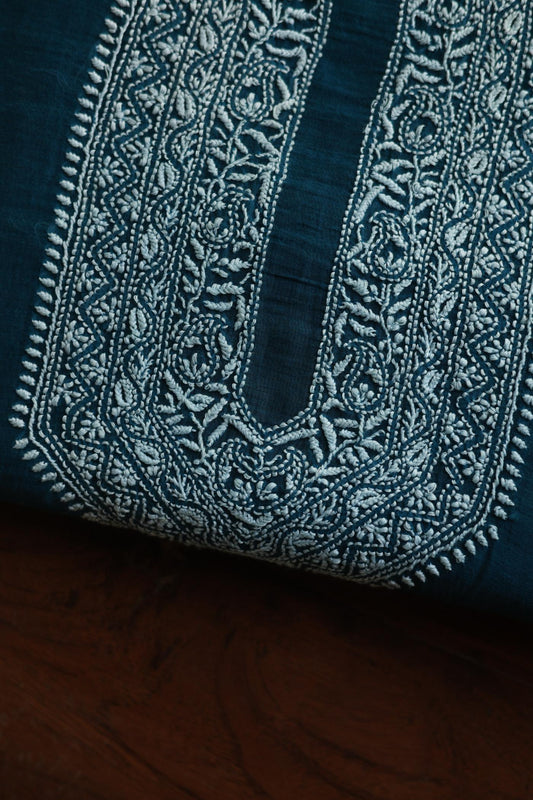 Prussian Blue Mulmul Chikankari Unstitched Men's Kurtas Fabric