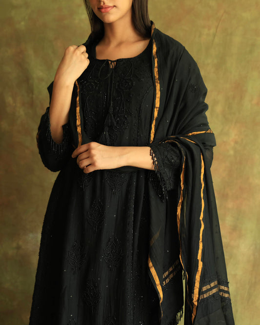 Black Malmal Pearl Work Chikankari A Line Kalidar Kurta With Dupatta