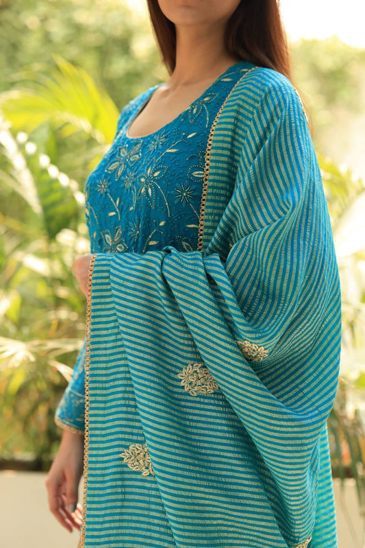 Blue Banarasi Noor Organza Chikankari Kurta With Dupatta
