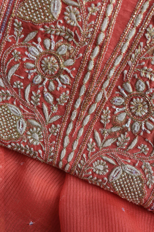 Carrot Pink Banarasi Zari Chanderi Unstitched Chikankari Fabric