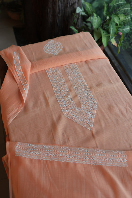 Coral Peach Mulmul Chikankari Unstitched Men's Kurtas Fabric