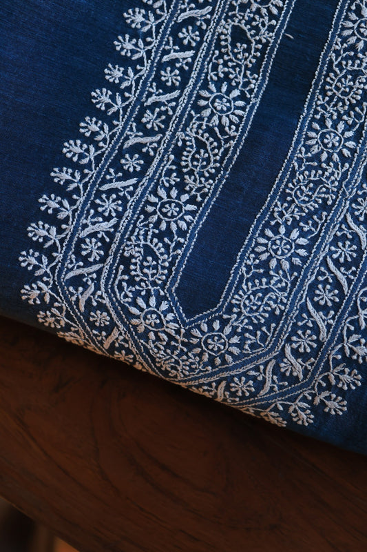 Indigo White Mal Chanderi Silk Chikankari Unstitched Fabric