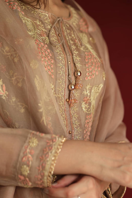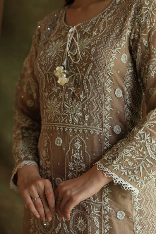 Pastel Beige Noor Organza Chikankari A Line Kurta With Dupatta