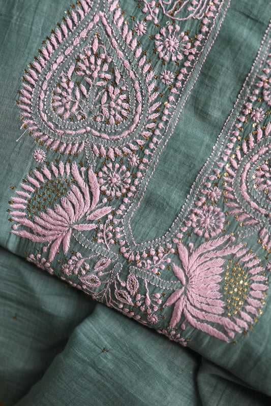 Dusty Teal Shade Moonga Silk Chikankari Unstitched Fabric