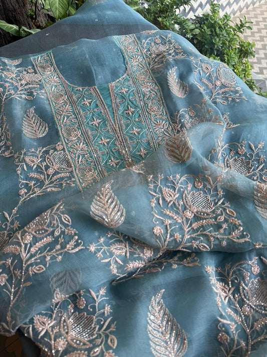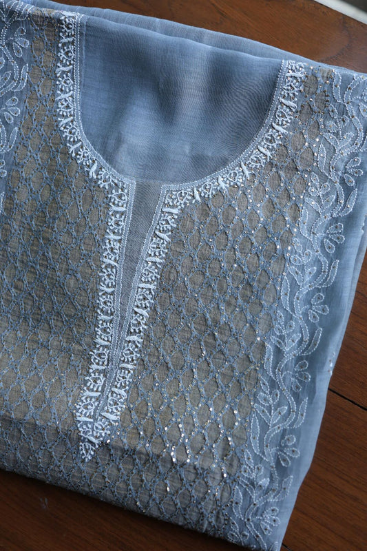 Blue Noor Organza Silk Fine Chikankari Unstitched Fabric