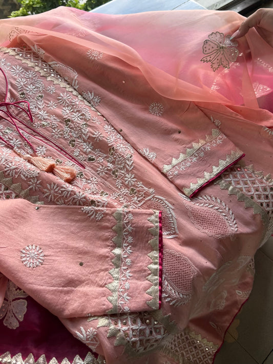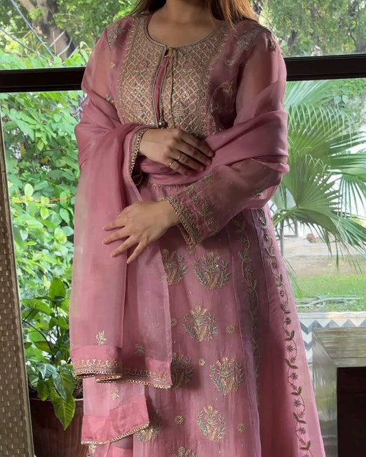 Pink Noor Organza Chikankari Anarkali Kurta With Dupatta