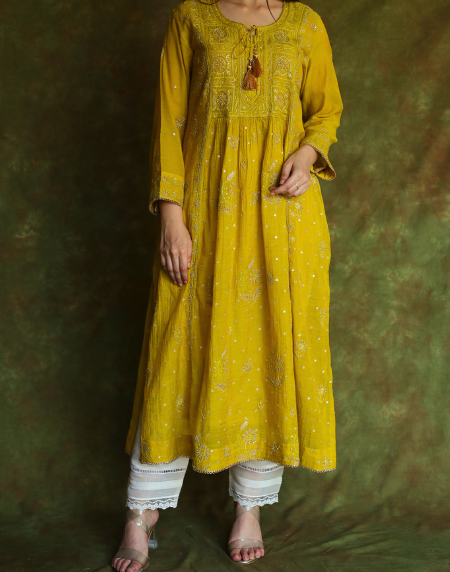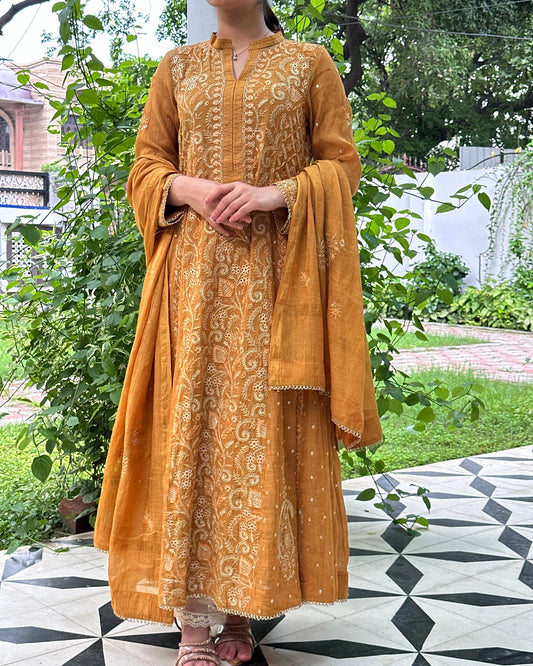 Mustard Yellow Tissue Silk Chikankari Anarkali