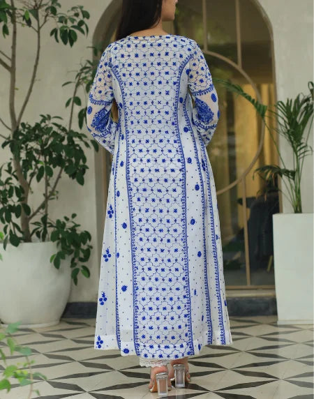 Indigo White Malmal Pearl Work Chikankari A Line Kalidar Kurta With Dupatta