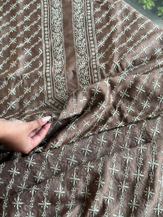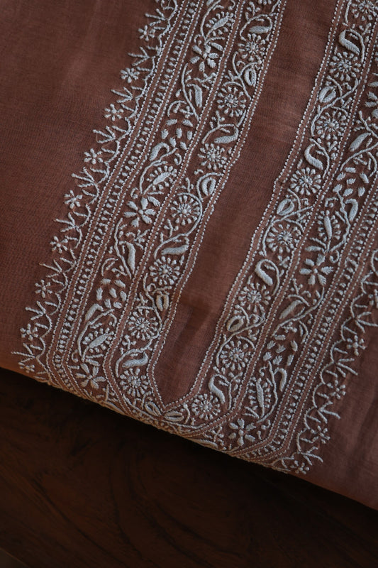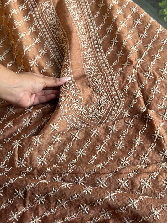 Tobacco Brown Shade Moonga Silk Chikankari Unstitched Fabric