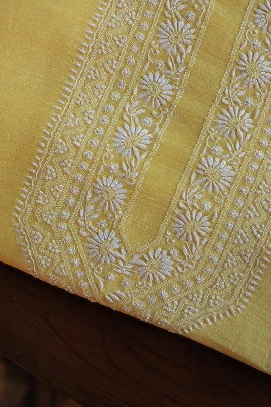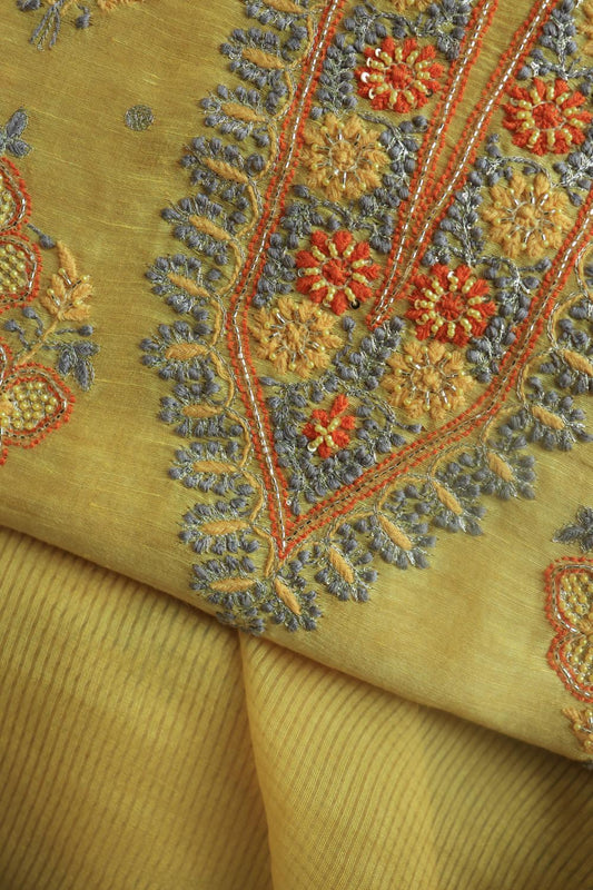 Yellow Linen Silk Chikankari With Ari Work Unstitched Kurta Dupatta Set