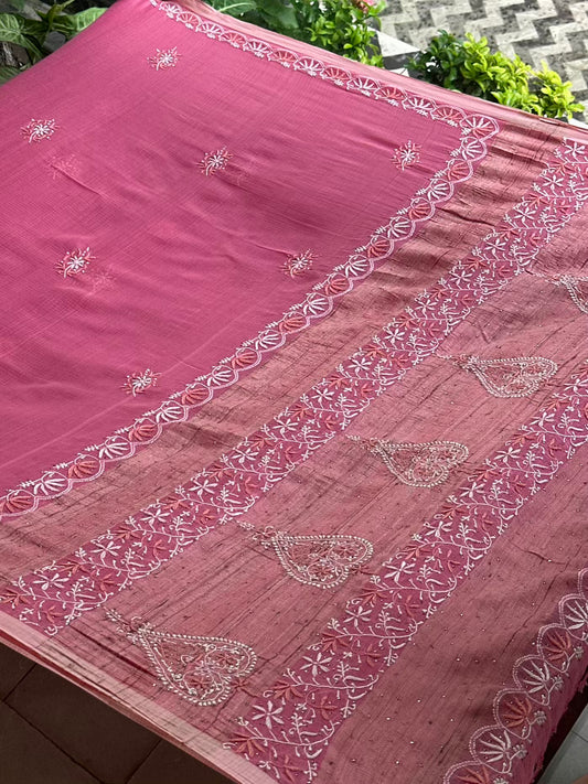 Pink Silk Gheecha Palla Kota Chikankari Saree With Mukaish Kamdani