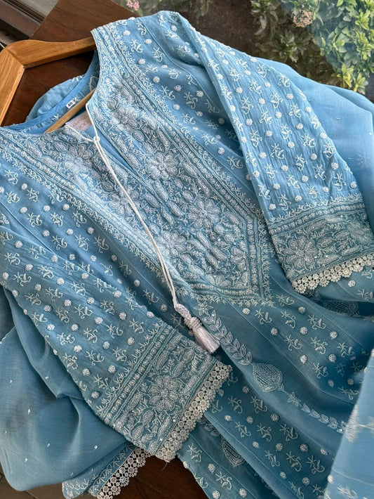 Powder Blue Malmal Pearl Work Chikankari A Line Kurta With Dupatta