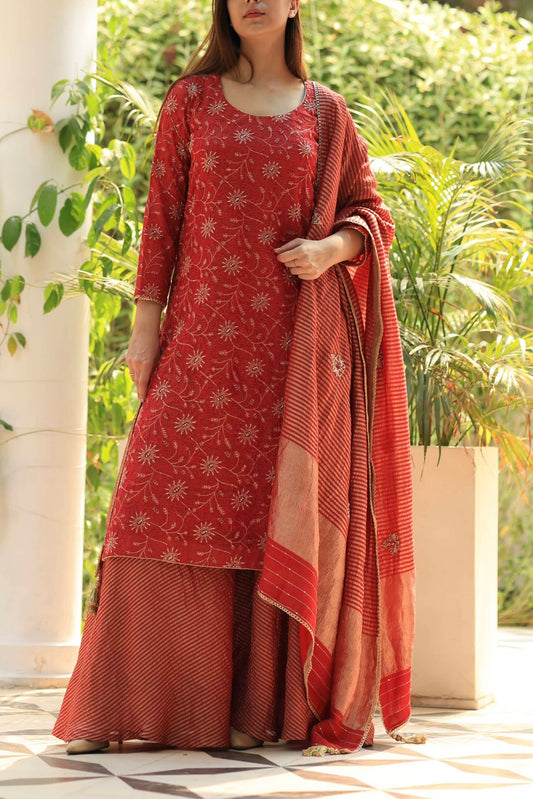 Red Silk Kota Chikankari Ari & Squins Work Sharara Set
