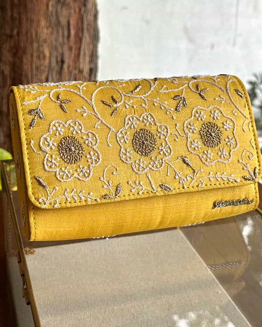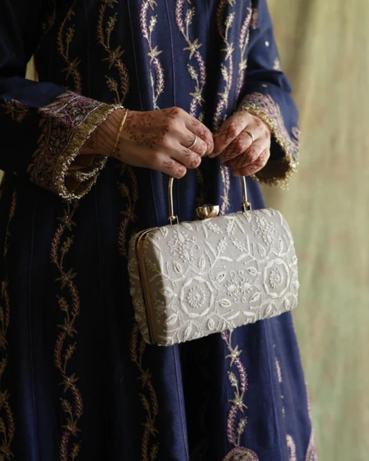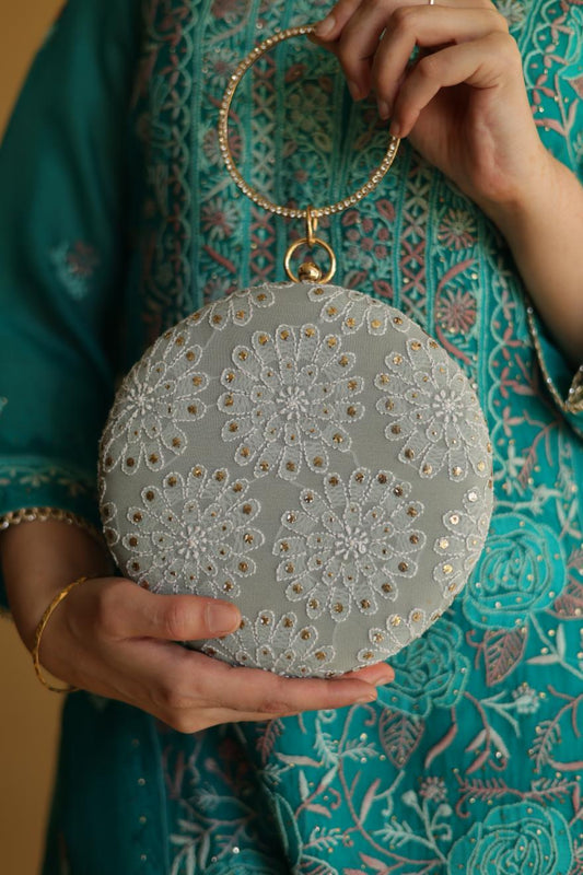 Grey Floral Motif Chikankari Linen Handle Sling Clutch