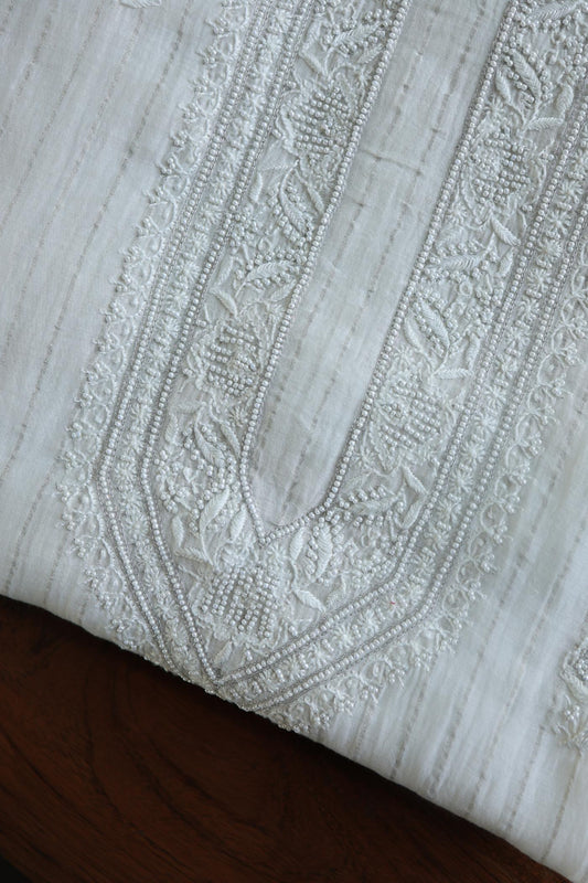 Silver White Zari Chanderi Unisex Chikankari Men’s Kurta Fabric