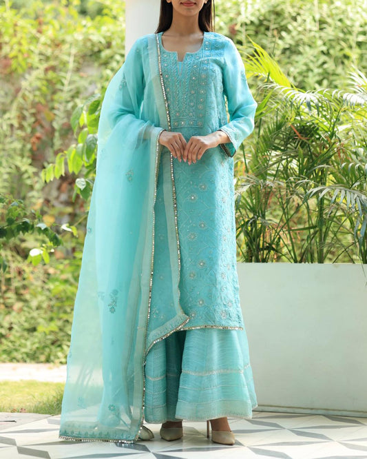 Sky Blue Organza Chikankari Ari Work Sharara Set