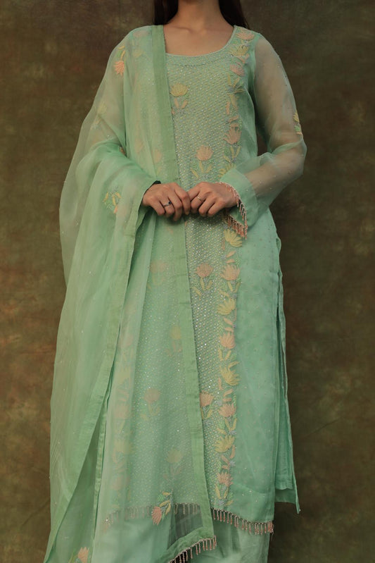 Sea Green Noor Organza Silk Zardosi Work Fine Resham Chikankari Kurta Set