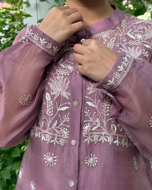 Dull Purple Noor Organza Resham Chikankari Front Open Short Top