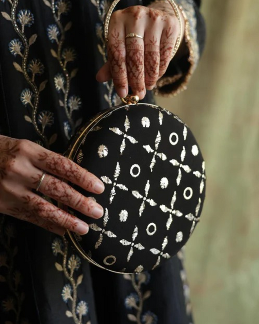 Round Shape Black Pure Georgette Mukaish Badla Sling Clutch