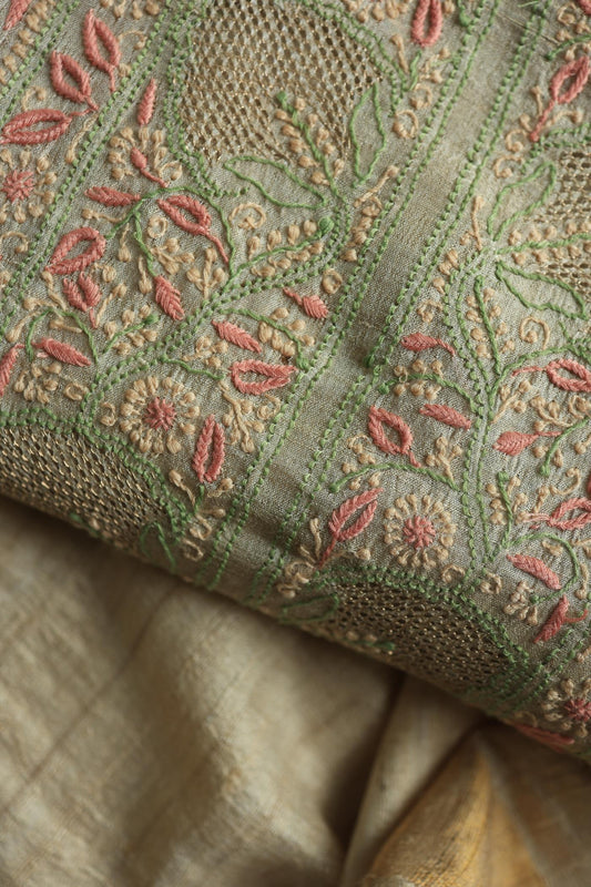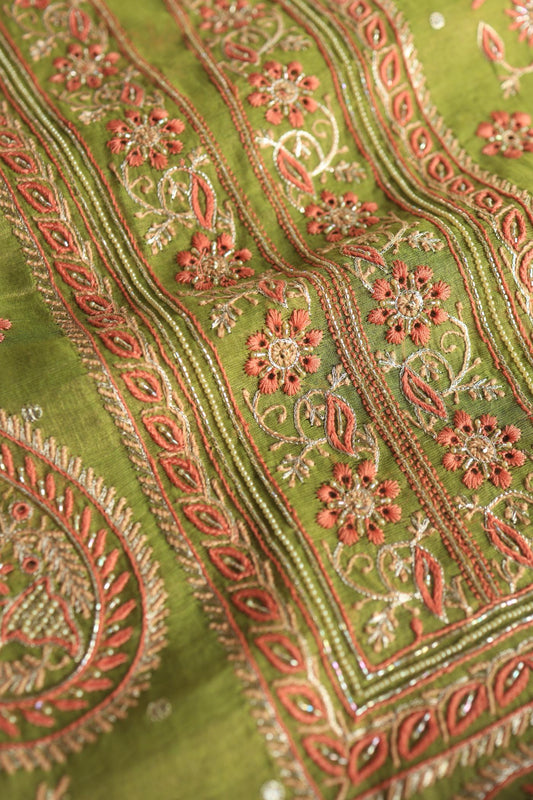Olive Green Tissue Silk Chikankari Unstitched Fabric