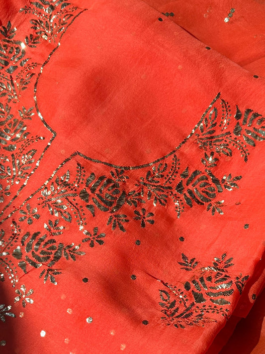 Neon Orange Noor Organza Silk Mukaish Badla Unstitched Kurta Dupatta Set