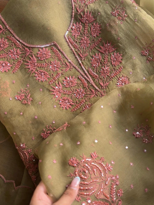 Olive Green Noor Organza Silk Chikankari Unstitched Kurta Dupatta Set