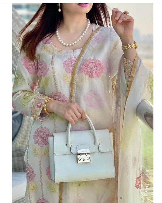 White Noor Banarasi Organza Chikankari Unstitched Fabrics