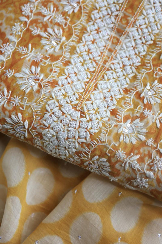 Yellow Mirror work Tussar Kota Chikankari Kurta set fabric