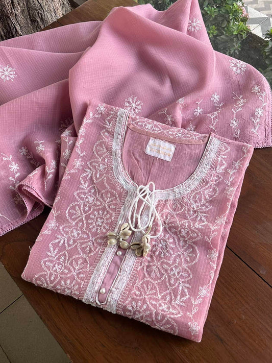 Pink Semi Stitched Kota Tepchi Chikankari Kurta Dupatta Set