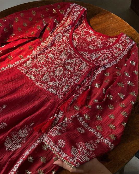 Saman Tomato Red | Malmal Mukaish Kamdani Chikankari Stitched Kurta Dupatta Set