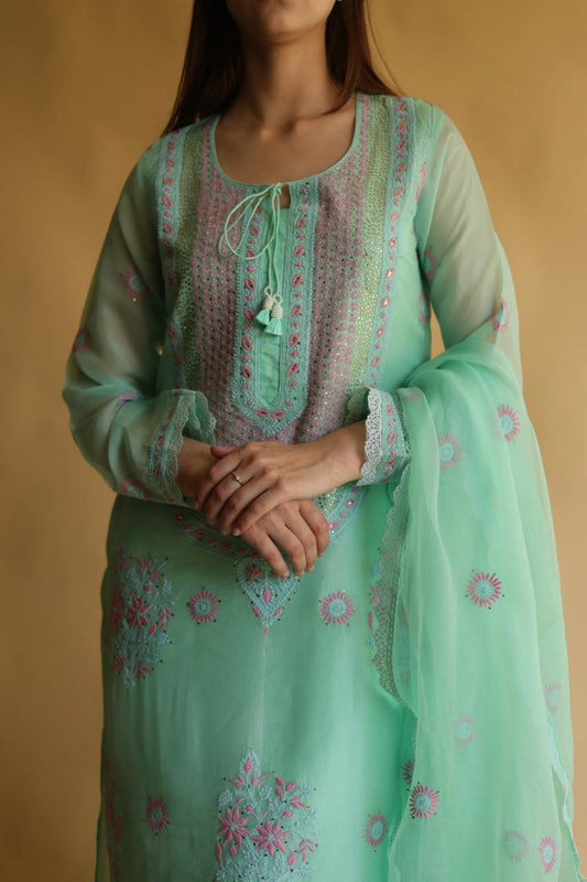 Sea Green Mukaish Kamdani Noor Organza Chikankari Kurta Set