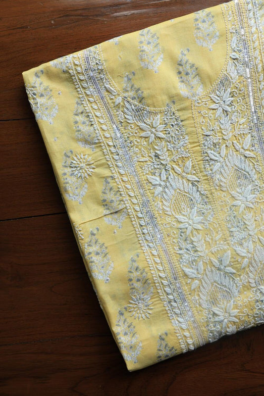 Yellow Cotton Chikankari Unstitched Kurta Fabrics