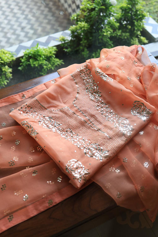Coral Peach Noor Organza Silk Mukaish Badla Unstitched Kurta Dupatta Set
