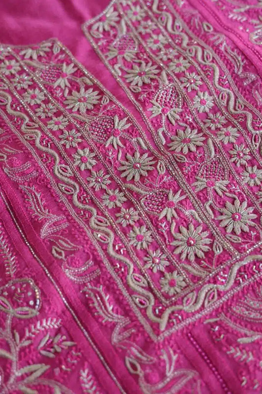 Dark Pink Moonga Silk Chikankari Unstitched Fabric