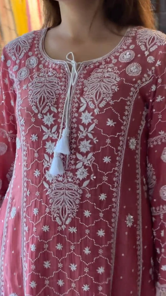 Peach Shade Mulmul Work With Chikankari Ready To Wear Anarkali With Dupatta