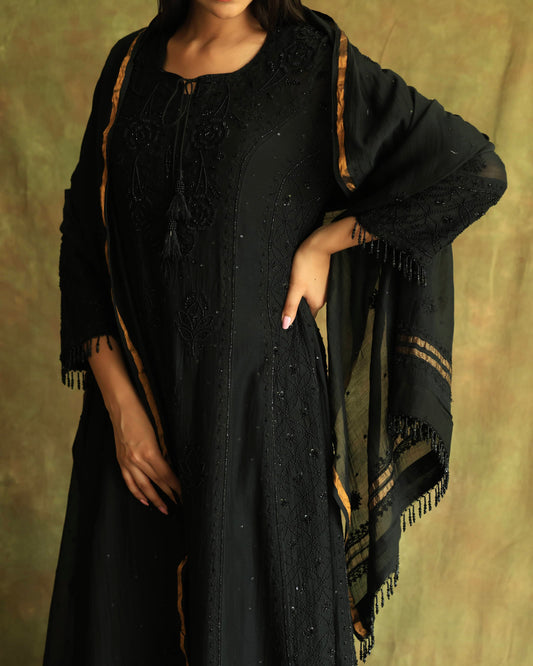 Black Malmal Pearl Work Chikankari A Line Kalidar Kurta With Dupatta